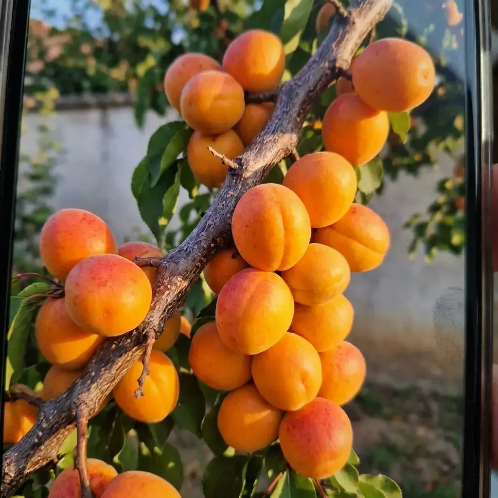 Плоди формуються по всій довжині кожної гілки, без жодних пропусків — як у китайської черешні. Кожна гілочка — суцільне абрикосове намисто від основи до кінчика. З одного дерева — до 120 кг.