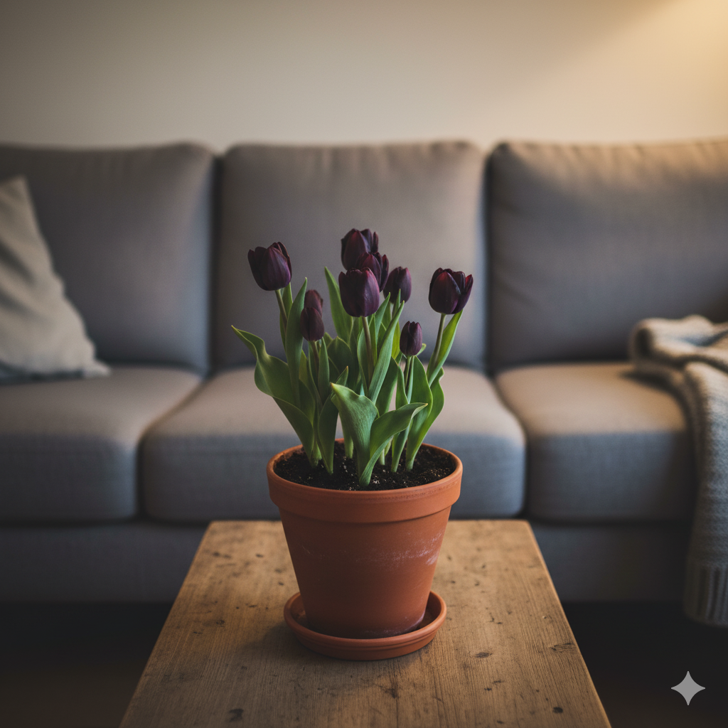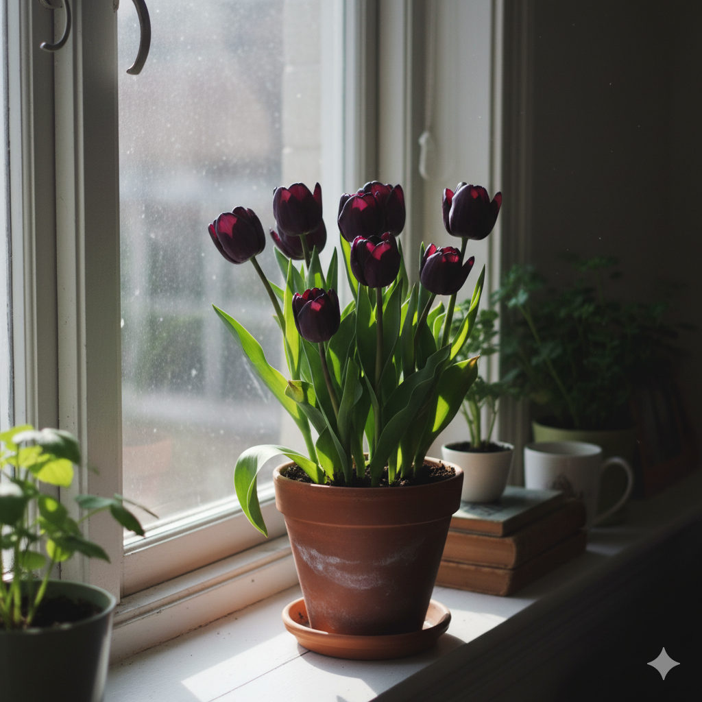 Ці тюльпани можуть цвісти кількома хвилями, наповнюючи інтер’єр глибиною кольору та шляхетною естетикою.