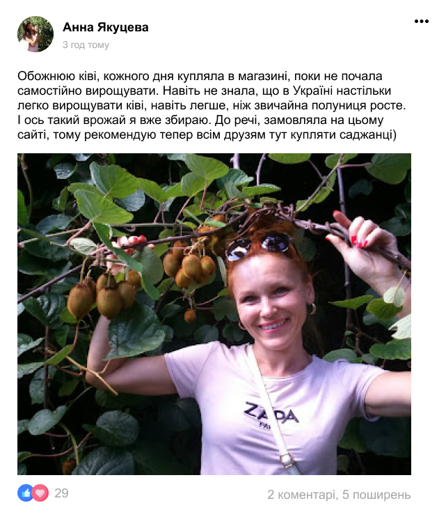 У нас найнижчі ціни на саджанці, які дають найбільшу кількість плодів та мають 100% приживлюваність у будь-якому куточку України. Більше вам не треба купляти ківі в магазині!