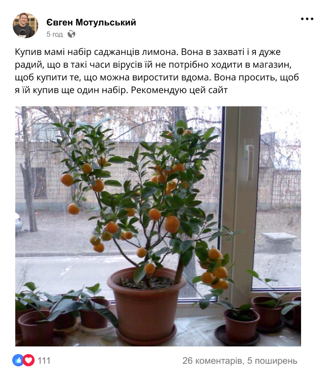 Наш постійний покупець, Микола Стецюк із Рівненщини, захопився вирощуванням рослин вдома після того, як 1 раз замовив у нас саджанці лимону. Тепер пан Микола, якому 67 років, знайшов справу життя і будує власний бізнес, пов'язаний із саджанцями рослин!